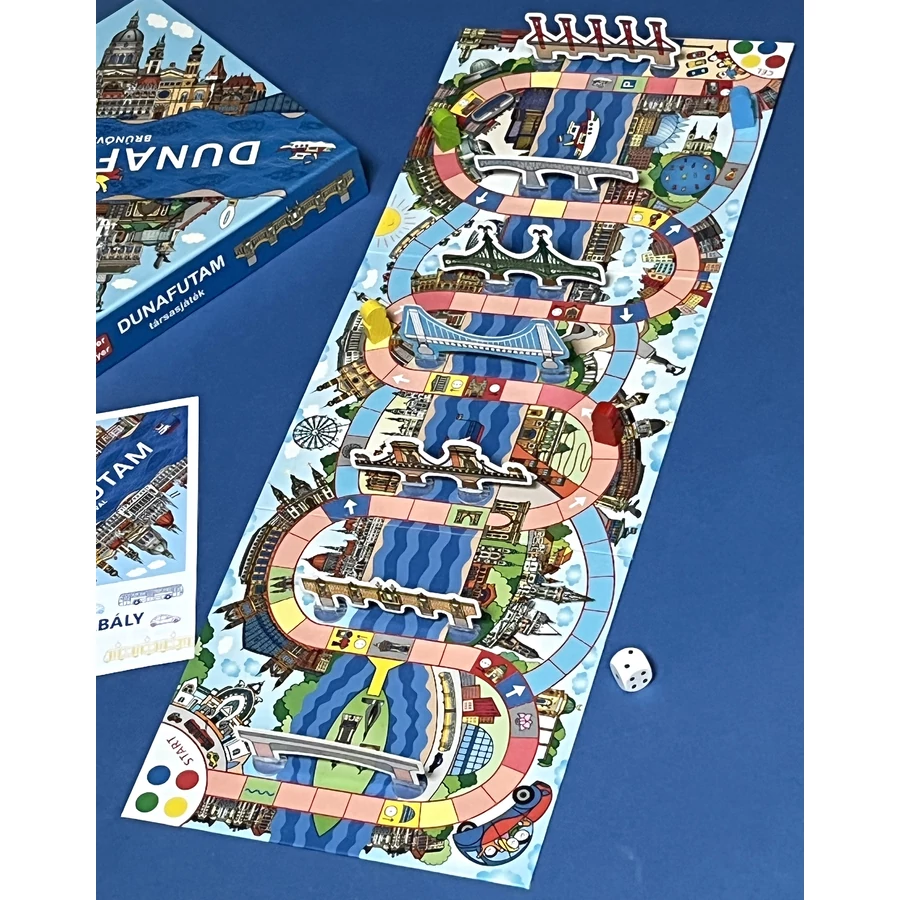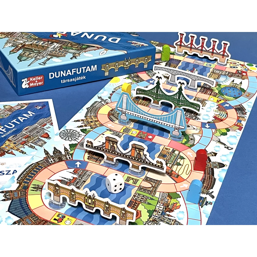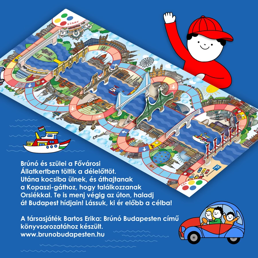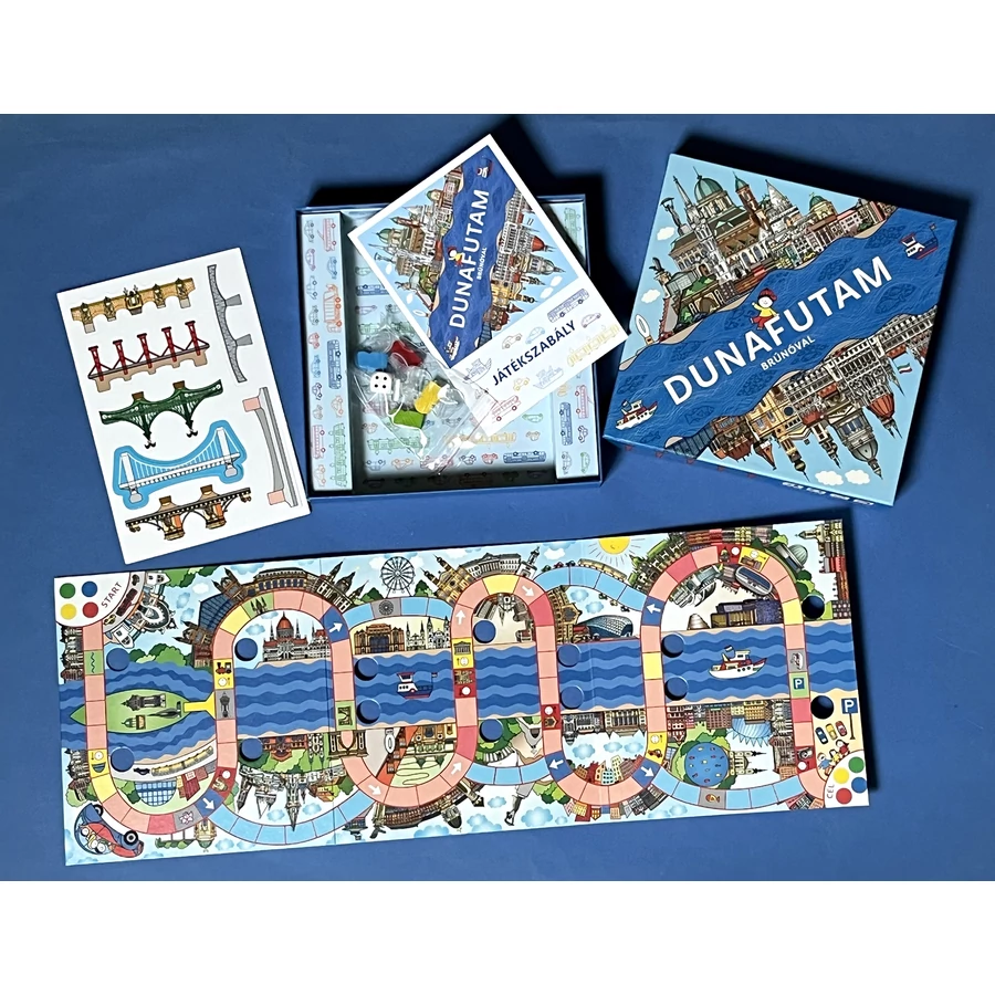 Brúnó és szülei a Fővárosi Állatkertben töltik a délelőttöt. Utána kocsiba ülnek, és áthajtanak a Kopaszi-gáthoz, hogy találkozzanak Orsiékkal. Te is menj végig az úton, haladj át Budapest hídjain! Lássuk, ki ér előbb a célba! A térbeli társasjáték Bartos Erika: Brúnó Budapesten című könyvsorozatának "DUNA" című kötetéhez készült. A játékot a szerző tervezte és rajzolta. Bartos Erika a Budapestről szóló könyveiért számos díjat vehetett át: a Fővárosi Közgyűlés Budapestért-díjjal tüntette ki, elnyerte a Szép Magyar Könyv Verseny Főpolgármesteri Különdíját és építészeti elismerést is kapott a nemzetközi Építészkongresszuson.