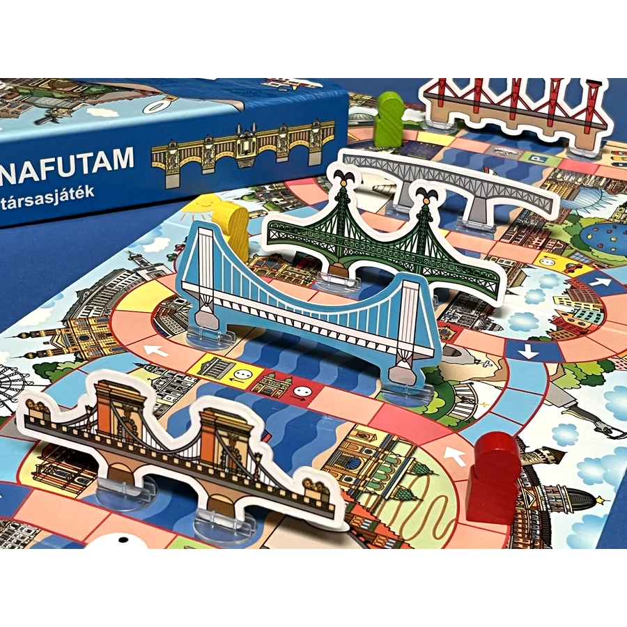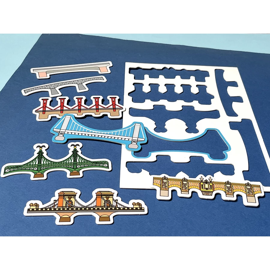 Tartalom: 1 db játéktábla 4 db bábu 7 db híd 14 db (hidanként 2 db) műanyag talp 1 db dobókocka Játékszabály A doboz mérete: 25 cm x 25 cm x 4,5 cm